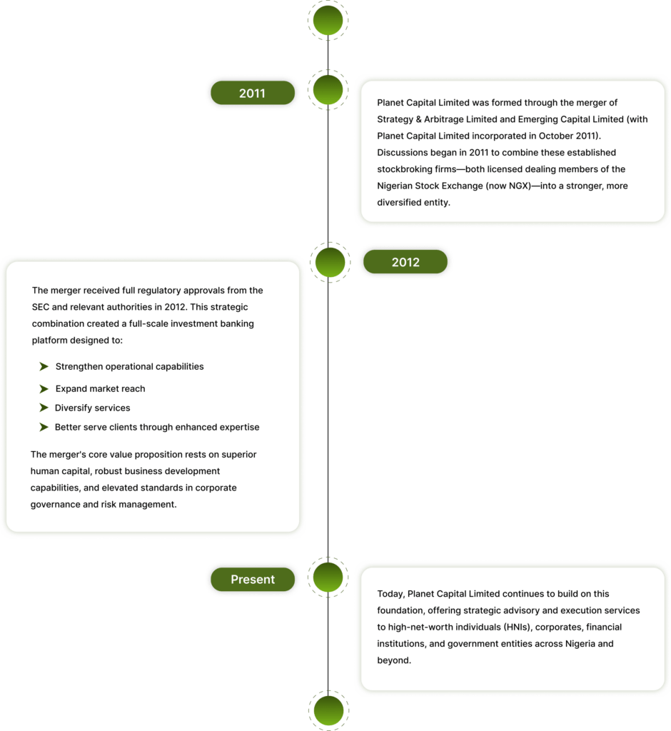Planet Capital is an integrated investment banking group providing solutions across corporate finance, capital markets, asset management, securities trading, and corporate governance advisory. We partner with corporates, financial institutions, governments, and sophisticated investors to structure and execute capital raising transactions, deliver strategic advisory, manage investment portfolios, and facilitate efficient market access. Our multidisciplinary platform enables seamless execution from origination through completion, underpinned by rigorous research, disciplined risk management, and deep market expertise.